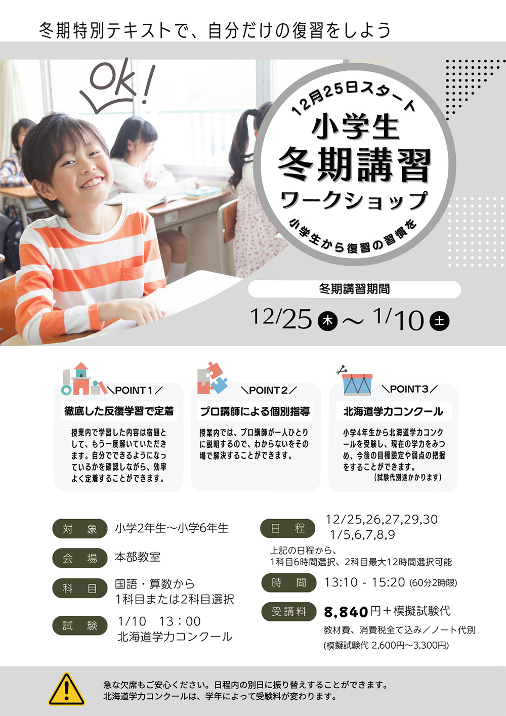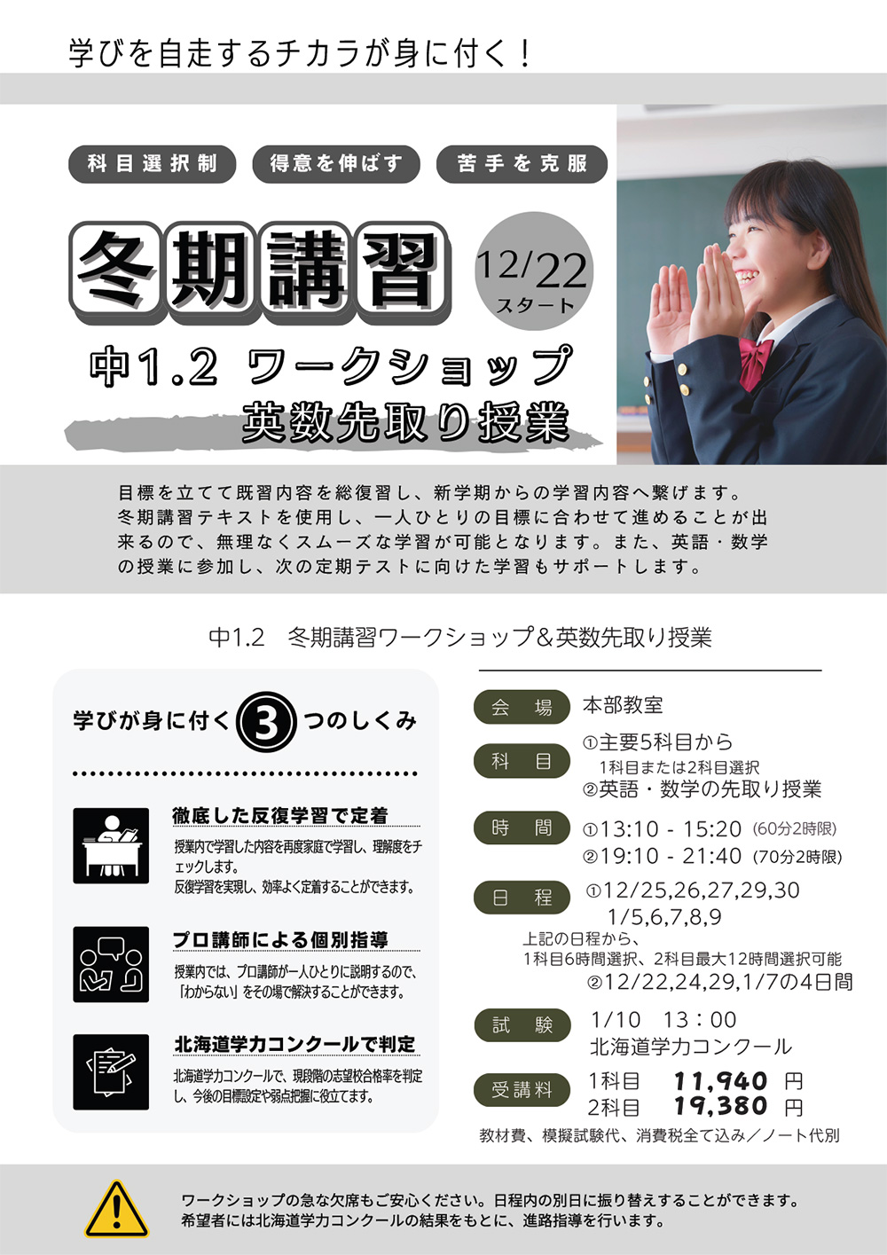 緑ヶ丘学院の「中学1・2年生/小学生 冬期講習ワークショップ」のご案内です。 PDFをダウンロードはこちらから ① お電話またはLINEでご連絡ください。 ② 受講申込書(押印箇所に押印し、必要事項を記入してください)と受講料をご持参の上、直接緑ヶ丘学院までお持ちください。 ・・・お申込締切りは2025年12月19日(金)ですが、定員になり次第受付終了となります。・・・ \ お気軽に /LINEでご質問 LINEで質問 \ または /お問合せメールフォームでご質問 メールフォーム \ おすすめ /お電話でご質問 tel:0125-23-5500 2025年11月27日 | 講習
