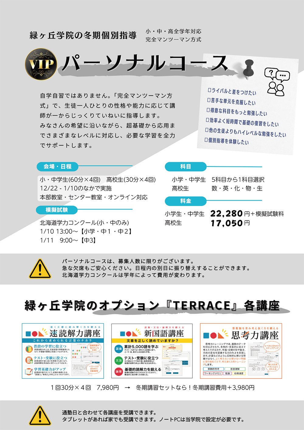 緑ヶ丘学院の「冬期個別指導 VIPパーソナルコース」のご案内です。