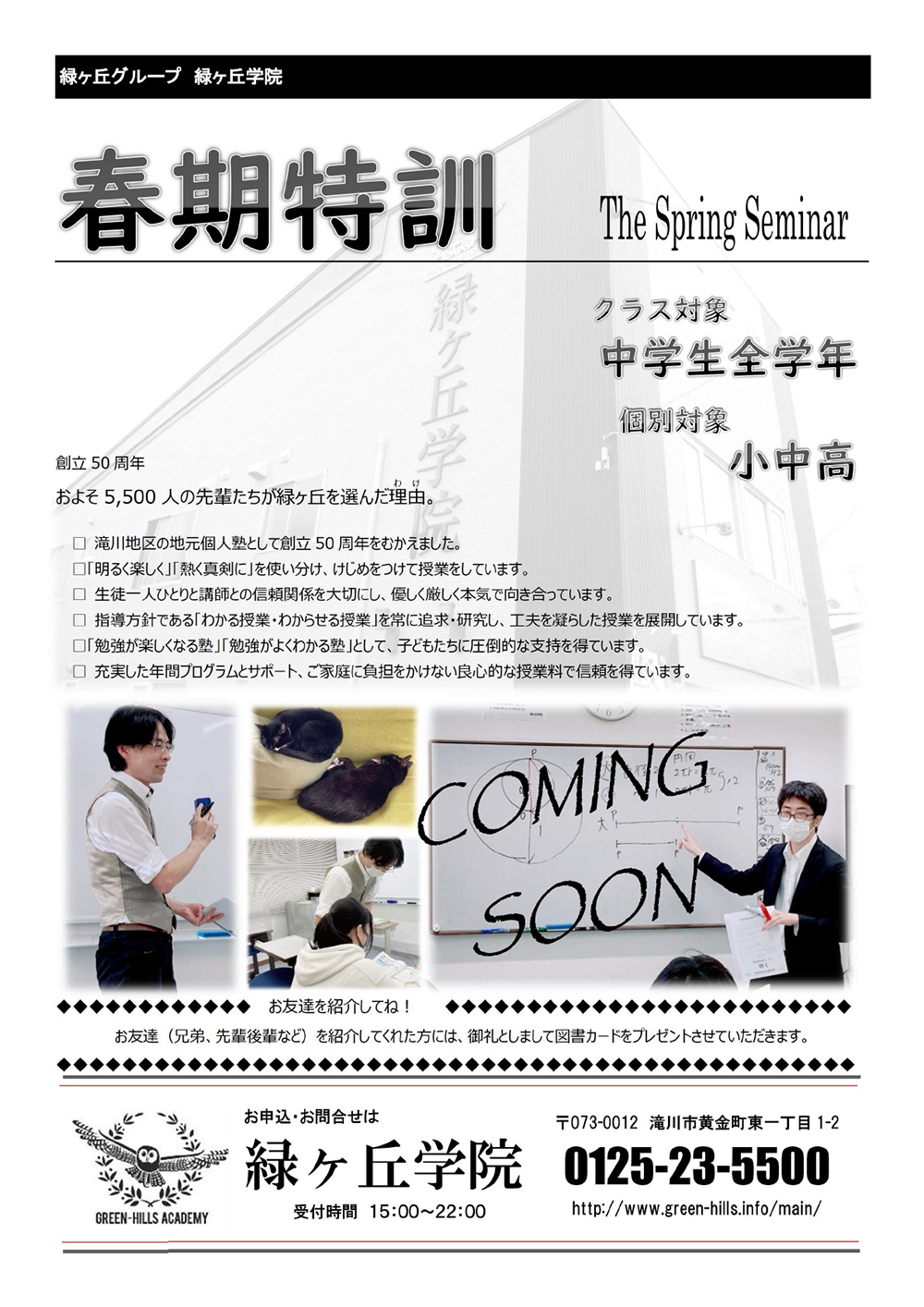 緑ヶ丘学院の春期特訓のご案内です。