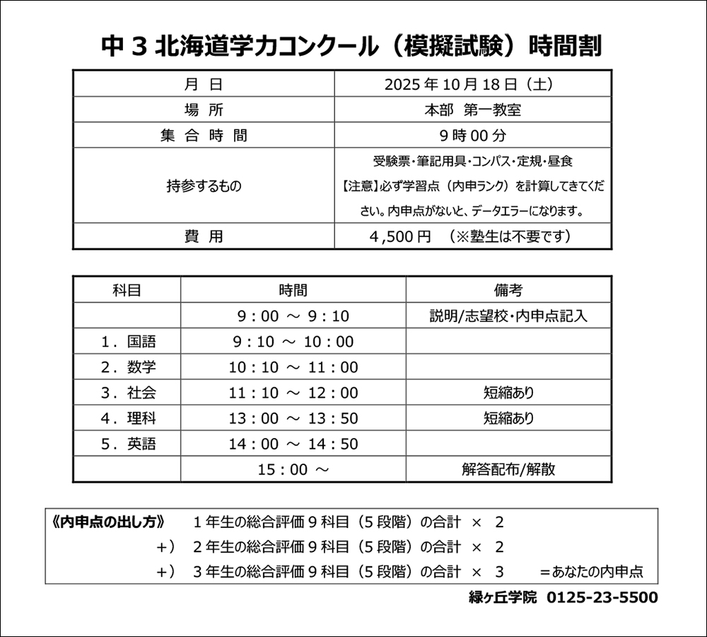 北海道学力コンクールは、本番さながらの問題が揃う模擬試験です。合格可能性判定で、志望校に向けて意識を高めます。 日程:2025年10月18日(土) 場所:緑ヶ丘学院本部 第一教室 集合時間:9時 PDFをダウンロードはこちらから 詳しい内容や不明点など、お気軽にご質問ください。 \ お気軽に /LINEでご質問 LINEで質問 \ または /お問合せメールフォームでご質問 メールフォーム \ おすすめ /お電話でご質問 tel:0125-23-5500 2025年9月20日 | 試験